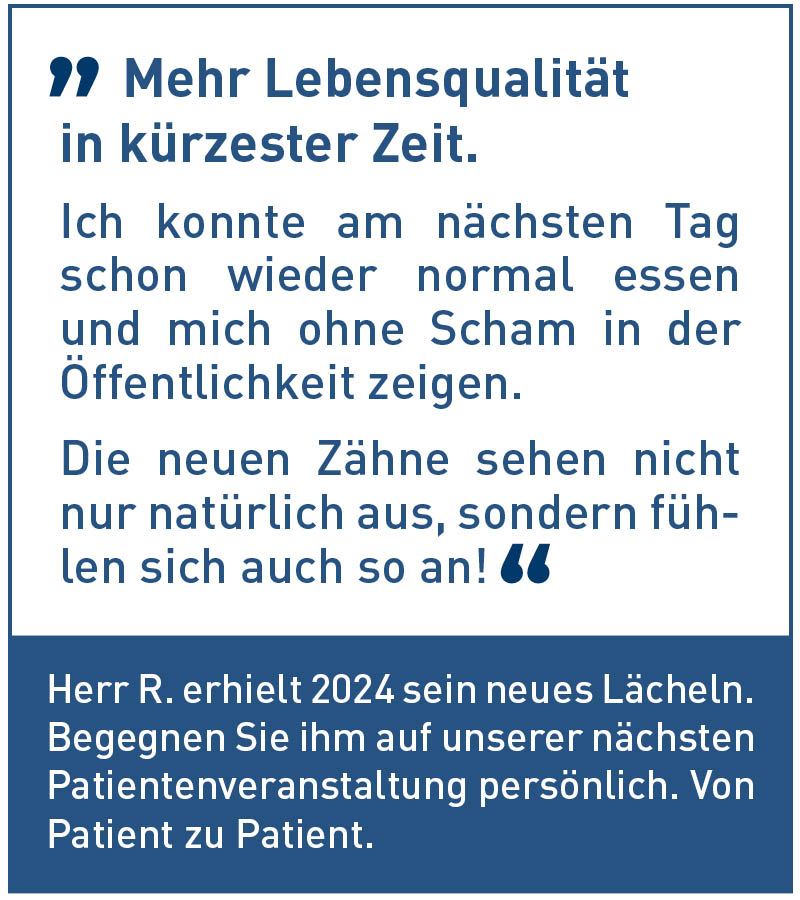 All-on-4 bedeutet nicht nur, sicher essen, sprechen und lachen zu können, sondern auch ein Plus an Lebensqualität: mehr Selbstbewusstsein, mehr Genuss und mehr Wohlbefinden – ganz ohne herausnehmbare Prothese.